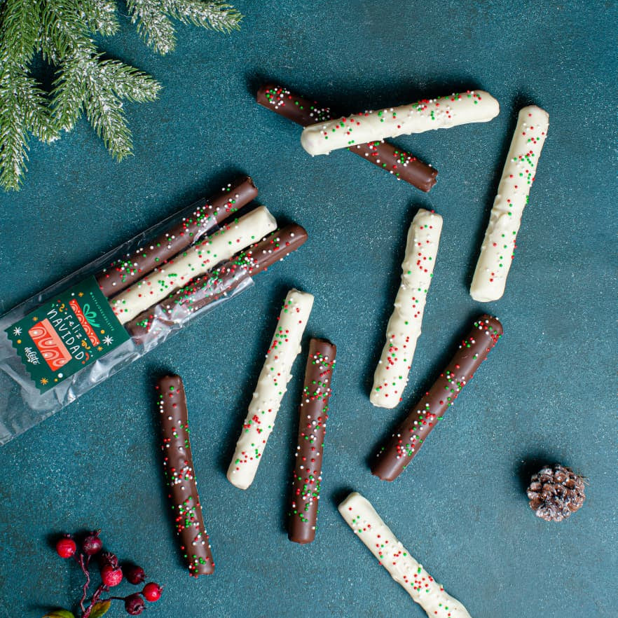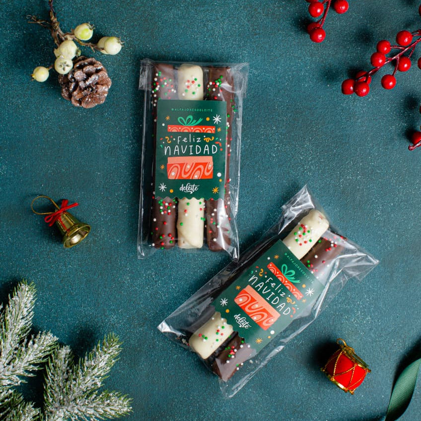 Cuchuflis rellenos con manjar, bañados en chocolate clásico (dulce) o blanco.